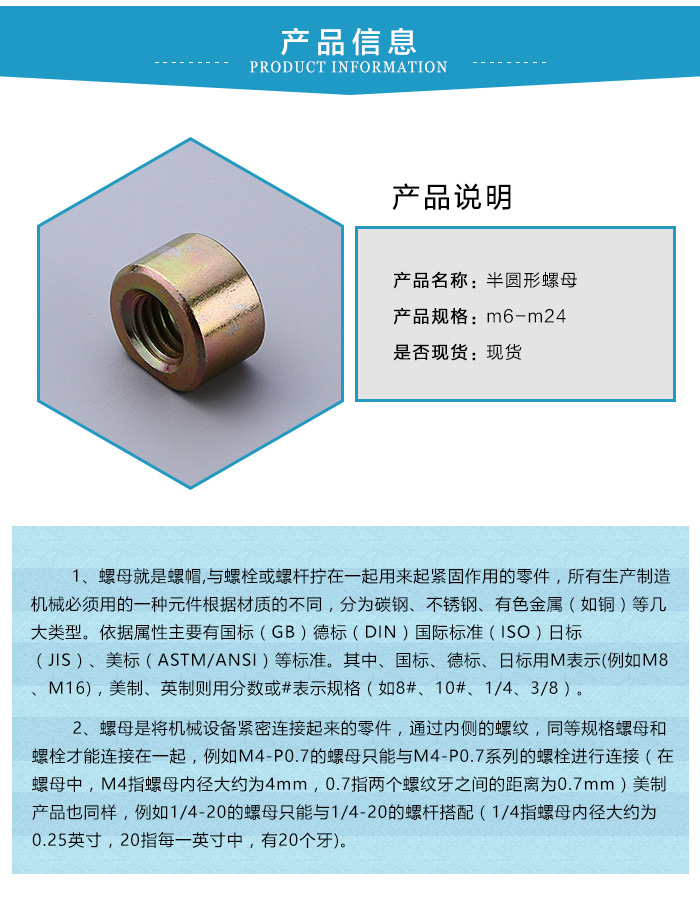 半圓形螺母的工作原理是采用螺母和螺栓之間的摩擦力進(jìn)行自鎖的。但是在動載荷中這種自鎖的可靠性就會降低。在一些重要的場合我們就會采取一些防松措施,保證半圓形螺母鎖緊的可靠性。鎖緊螺母就是其中的一種防松措施。